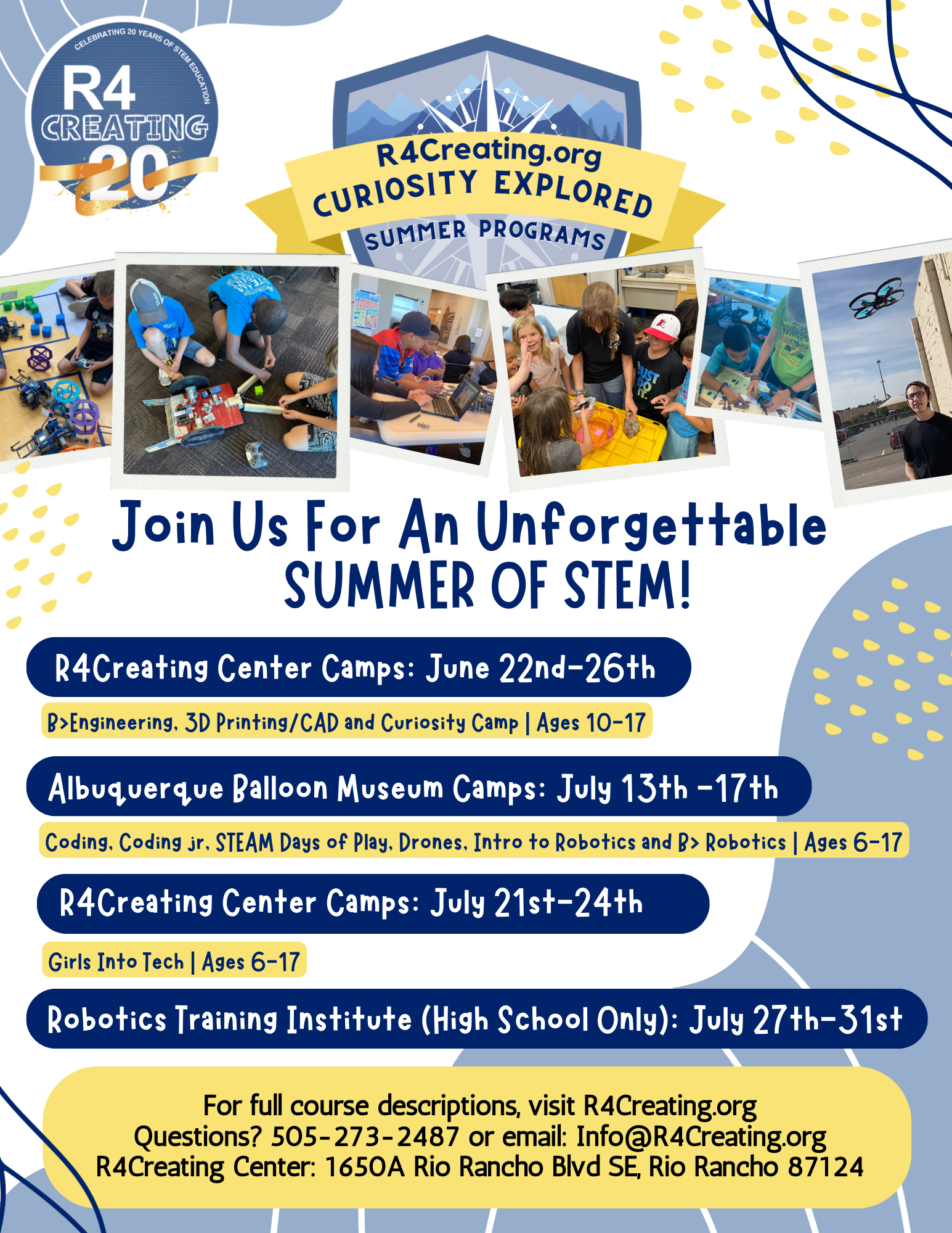 The Artificial Intelligence Foundations and Robotics Camp at R4Creating returns in Summer 2026 with an immersive week focused on AI, Python programming, and mobile robotics. Open to high school students, the camp uses curriculum from the New Mexico Artificial Intelligence Academy (NMAIA) to introduce students to real-world AI concepts through hands-on coding, robotics challenges, and problem-solving activities.
